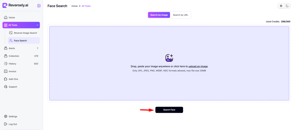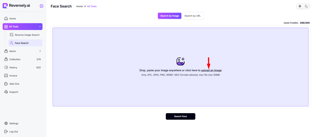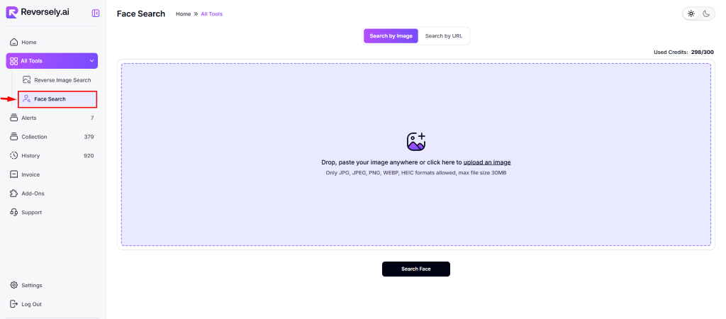 Visit Reversely.ai and open the face search tool from the sidebar menu. This will take you to the dedicated interface.