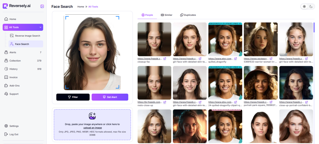 While the tool can efficiently detect multiple faces, focusing on one person per search gives more accurate results. Crop your image to show mainly the face you want to search for.
