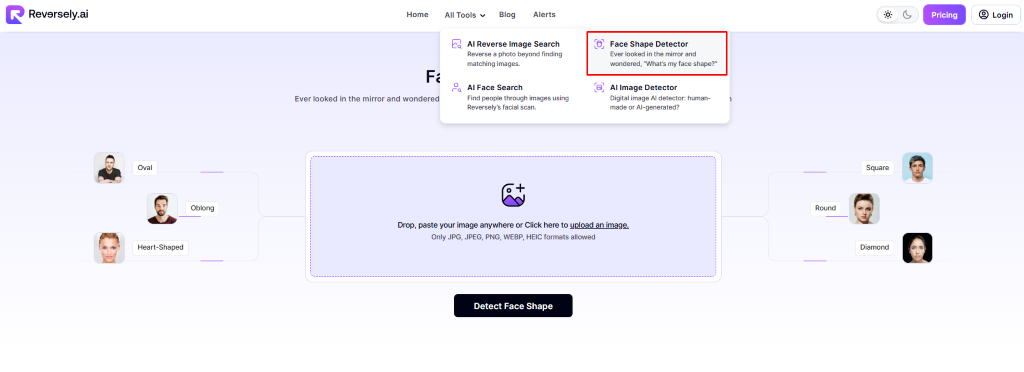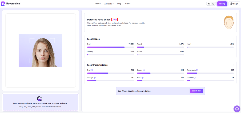 Reversely’s face shape detector analyzes facial features to identify face shape in various categories. It processes uploaded images and provides classification results based on facial measurements and proportions.