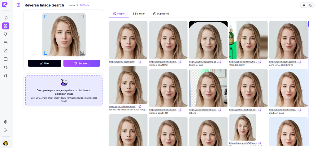 Reversely searches across a vast database of indexed pages, social media platforms, blogs, news portals, and e-commerce stores. It delivers broad coverage and increases the likelihood of detecting even subtle modifications to your images online.